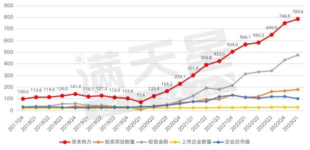 從投資熱力看,2023Q1投資熱力值是784.8,環比增長4.8%,同比增長38.6%。從分項指標看,2023年一季度投資項目數量和投資總額均有增長,產能擴張延續了高增長。從上市企業表現看,數量總體穩定,但隨著市場規模收縮,上市企業市值也存在一定程度的縮水。
