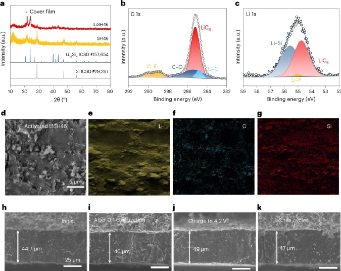 通過XRD、XPS、AES和截面SEM對LiSH46負極進行進一步表征,由于Si的邊界融合反應,Si和硬碳都失去了原始的規則形貌,形成了交聯結構。電極含有Li15Si4和LiC6富鋰相構成導電網絡,增大了電極活性面積。且由于富鋰相的易形變特性,使得電極結構穩定性提升。如截面SEM顯示,電極循環前后厚度變化不大,且裂紋數量明顯少于Si負極。