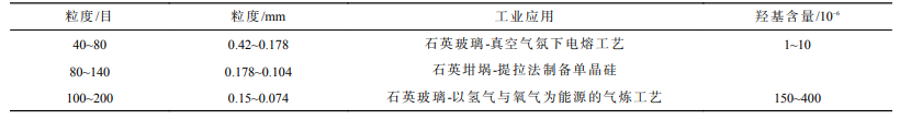 高純石英產品第二個重要特征是它們的粒度要求,即加工的產品是砂,是具有一定粒度的產品。粒度作為高純石英一個重要指標,其粒度范圍一般是40~150目,具體粒度應根據工業應用確定。如表2所示,采用真空氣氛下電熔工藝制備石英玻璃,粒度要求40~80目;提拉法制備單晶硅的石英坩堝,粒度要求80~140目;以氫氣與氧氣為能源的氣煉工藝制備石英玻璃,粒度要求100~200目。