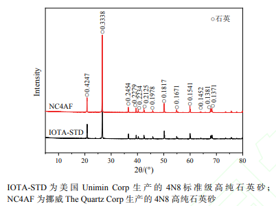 圖1 美國和挪威高純石英砂的X-射線粉晶衍射分析(XRD)譜圖