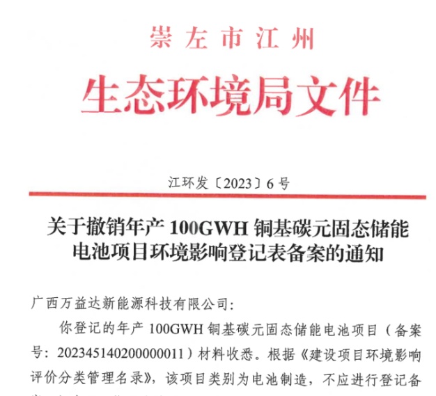 6月13日,崇左市江州生態(tài)環(huán)境局發(fā)布《關(guān)于撤銷年產(chǎn)100GWH銅基碳元固態(tài)儲能電池項目環(huán)境影響登記表備案的通知》。通知顯示,該項目違反了《建設(shè)項目環(huán)境影響登記表備案管理辦法》第十六條規(guī)定,項目已經(jīng)取得的備案無效,予以撤銷。據(jù)悉,該項目由廣西云桂新能源科技有限公司投資建設(shè),項目規(guī)劃總投資300億元,分三期建設(shè)。