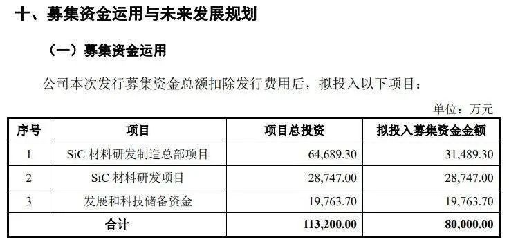 經公司2023年5月19日召開的2022年度股東大會審議通過,本次發行募集資金扣除發行費用后將用于SiC材料研發制造總部項目、SiC材料研發項目、發展和科技儲備資金。
