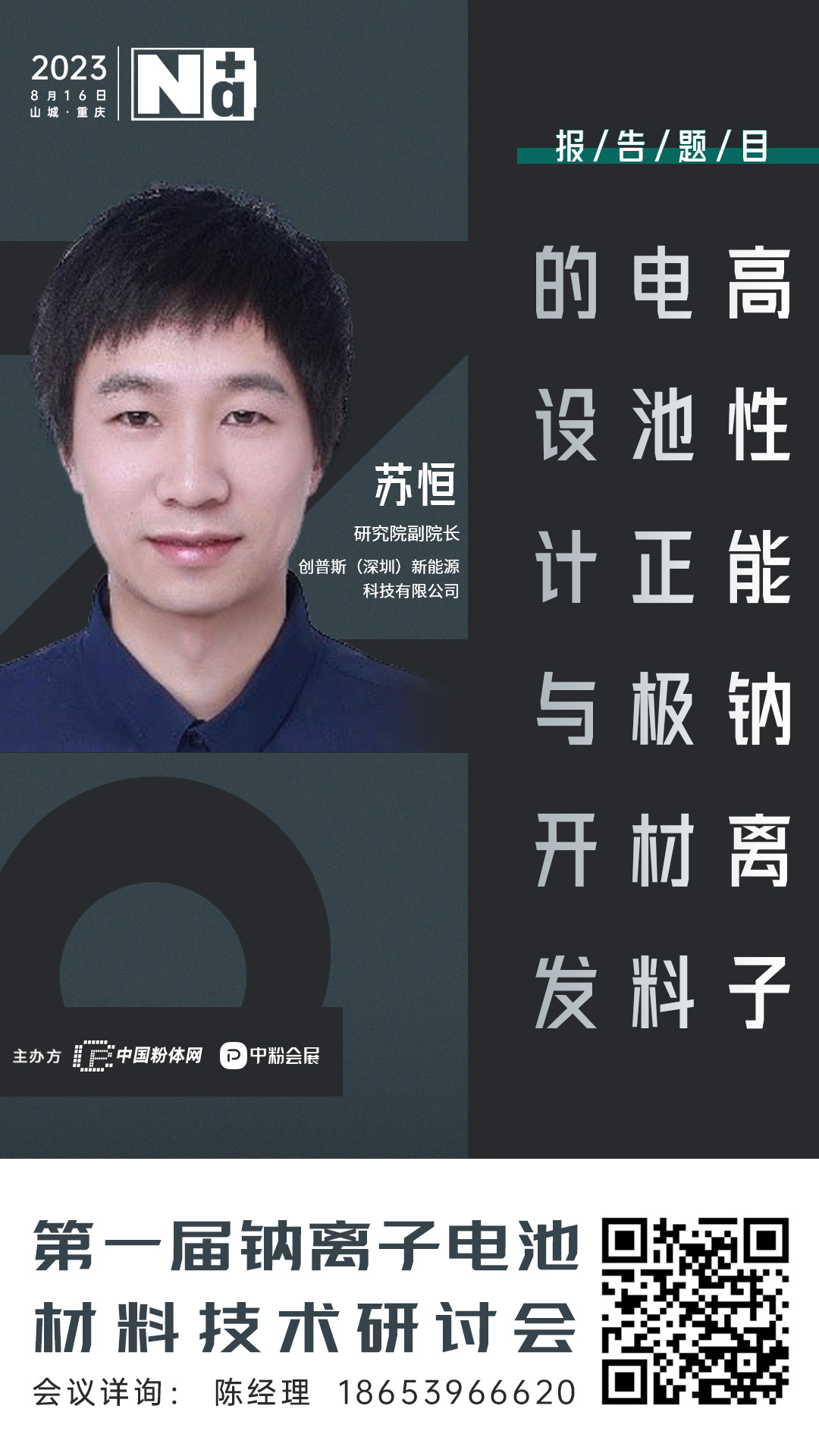 2023年8月,中國粉體網將在山城重慶舉辦“2023先進正極材料技術與產業高峰論壇暨第一屆鈉離子電池材料技術研討會”。我們有幸邀請到創普斯(深圳)新能源科技有限公司鈉電研究院的蘇恒副院長為我們帶來題為《高性能鈉離子電池正極材料的設計與開發》的報告。