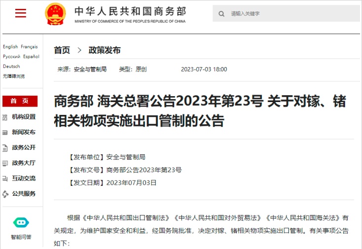 其中,鎵相關物項包含氮化鎵、砷化鎵、銦鎵砷等;鍺相關物項包含磷鍺鋅、鍺外延生長襯底、二氧化鍺等。該公告自2023年8月1日起正式實施。