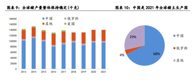 據USGS數據,全球鍺資源中國占比41%,美國占比45%。2021年全球原生鍺產量約130噸,其中,中國、俄羅斯兩國的產量占全球的70%,中國是全球最大的鍺生產國,占比達68%,近十年來累計供應全球68.5%的鍺。而美國雖然是全球最大的鍺資源儲量國,但自1984年以來,就將鍺作為國防儲備資源進行保護,尤其是近幾年已基本不再進行鍺的開采。