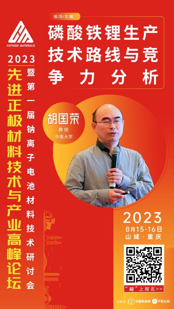 2023年8月,中國粉體網將在山城重慶舉辦“2023先進正極材料技術與產業高峰論壇暨第一屆鈉離子電池材料技術研討會”。我們有幸邀請到中南大學的胡國榮教授為我們帶來題為《磷酸鐵鋰生產技術路線與競爭力分析》的報告。
