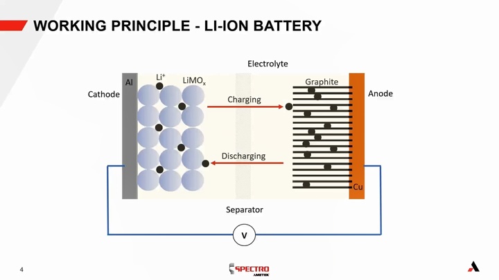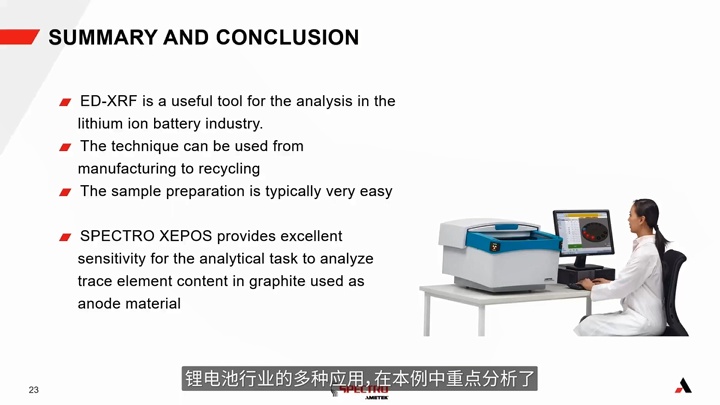Dirk Wissmann經理在報告中對鋰離子電池的構成及工作原理做了簡要介紹,講解了鋰電池的四大主材,正極、負極、隔膜及電解液。他系統的介紹了XRF的基礎知識,結合ED-XRF儀器,對XRF技術進行講解,并向大家闡述了SPECTRO XEPOS儀器的特色以及在鋰電石墨負極、硅負極痕量元素分析方面的應用。