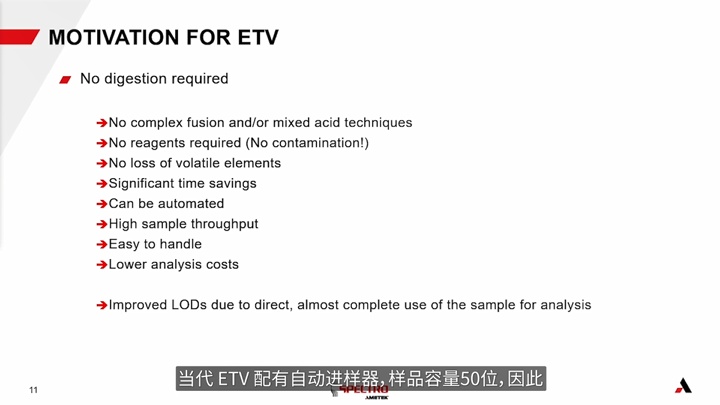 Olaf Schulz經理在報告中對ETV-ICP-OES直接進樣法技術進行了介紹并展示了該技術的特色及優點。他簡要講解了ICP-OES進樣法的工藝,介紹了固體及液態樣品的引入技術,以及ICP-OES法的優勢。ETV技術在20世紀80年代被開發出來,早期該技術應用起來非常麻煩,僅限于某些特殊領域,比如分析一些難以消解的材料,陶瓷和耐火材料等。過去的ETV系統必須手動操作,經過技術迭代,現代的ETV配有自動進樣器,有更高的樣品通道。Olaf Schulz經理詳細的講解了ETV-ICP-OES在石墨負極元素分析中的應用。ETV結合ICP-OES可以成為分析石墨中微量元素的一種非常快速、簡單且可靠的方法。同時,將用于數據評估的ICPAnalyzerPro儀器軟件與之集成使用,可以大大簡化工作流程。由于ETV-ICP-OES以較低的成本提供了性價比較高的檢測技術,因而它在實際應用中具備很強的技術競爭力。