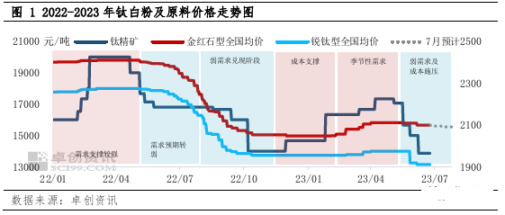 7月份鈦白粉市場價(jià)格主導(dǎo)在于淡季需求量的折減和生產(chǎn)端相應(yīng)的產(chǎn)出調(diào)整,而原料端預(yù)計(jì)鈦礦及硫酸窄幅波動(dòng),對國內(nèi)鈦白粉市場方向性影響有限。從圖1走勢來看,6月份鈦白粉市場整體下跌為主,月末價(jià)格調(diào)整后暫時(shí)持穩(wěn),不過價(jià)格承受的向下壓力并未消失。6月份涂料、塑料主要下游已進(jìn)入淡季節(jié)奏,開工下滑進(jìn)而決定了鈦白粉需求量的減少。與此同時(shí),生產(chǎn)端部分廠家接單較少,疊加月內(nèi)的減產(chǎn)保價(jià)策略,此番調(diào)整預(yù)示著供方的看空預(yù)期也在強(qiáng)化。同時(shí)原料端受鈦白粉開工下滑影響,價(jià)格同樣呈現(xiàn)偏弱,因此成本端對價(jià)格施加的有限影響也是利空方向。因此月內(nèi)重點(diǎn)關(guān)注方向還是放在主要下游采購節(jié)奏以及生產(chǎn)商裝置檢修的變化上。