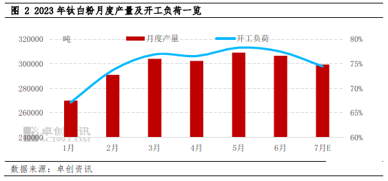 7月正值夏季,高溫使得地產(chǎn)下游施工條件受限,鈦白粉需求量自然呈現(xiàn)季節(jié)性下滑,多數(shù)鈦白企業(yè)也有相應(yīng)調(diào)整自身開工以及安排年中檢修。除了正常檢修計(jì)劃的執(zhí)行,行業(yè)的普遍出貨壓力也促使生產(chǎn)環(huán)節(jié)部分企業(yè)延長檢修期來維持產(chǎn)出量與接單量的相對平衡,避免自身承受過多庫存壓力。因此考慮不同鈦白企業(yè)檢修策略以及周期長短不一的情況,預(yù)計(jì)7月份鈦白粉產(chǎn)出量約為29萬噸左右,產(chǎn)出量較6月份已有較為明顯的下調(diào)(圖2)。生產(chǎn)商減量更多是企業(yè)對淡季行情的主動(dòng)調(diào)整,產(chǎn)出量的減少更多作用在生產(chǎn)企業(yè)淡季低庫存和價(jià)格相對平穩(wěn)程度之上,而不足以影響價(jià)格的運(yùn)行方向。