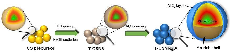 富鎳的核心提供高的比容量,而富錳的外殼加上Ti摻雜與表面Al2O3包覆層的存在保證了材料的結構穩性。這種精心設計的結構不僅有效抑制了循環過程中由于晶格反復體積變化體相和表面結構坍塌,還極大的提高了脫/嵌鈉動力學,該正極化學機械穩定性高,改善了電子/離子傳輸速率,實現了高效儲鈉行為。當作為具有競爭力的正極使用時,基于T-CSN6@A的準固態NIBs在−20至50℃的工作溫度下具有顯著的寬溫耐受性儲鈉行為,同時在25℃時具有高達≈255 Wh/Kg的能量密度。該項工作可行的改性策略為設計先進的O3型富鎳正極提供了一個新的途徑,以實現下一代鈉離子電池的大規模工業化發展。