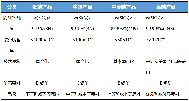 高純石英產(chǎn)品分類與礦石原料品質(zhì)要求