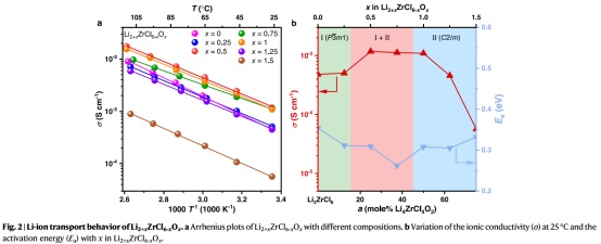 電化學阻抗譜測試表明上述雙結晶相共存的成分確實具備更高的離子電導率。與預期結果一致,結晶度較低的雙結晶相成分的室溫離子電導率普遍高于單結晶相成分。成分點x= 0.5(化學式:Li2.5ZrCl5.5O0.5)的室溫離子電導率達到了1.17mS cm-1,即便與稀土或銦基氯化物固態電解質相比也毫不遜色。