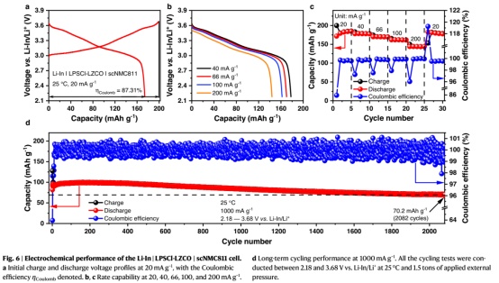 當使用單晶LiNi0.8Mn0.1Co0.1O2(scNMC811)作為正極時,全固態電池依然表現出優秀的循環性能。該電池在25℃、20mAg−1下充放電時的首圈庫倫效率為87.31%。即使在1000mAg−1的大電流密度下循環2082次之后,放電容量仍然能達到70.2mAhg-1,和報道于《Nature Energy》的Li2In1/3Sc1/3Cl4固態電解質所組成的類似電池的性能(540mAg-1, 3000次循環,約70mAhg-1最終放電容量)不相上下。但是,由于Li1.75ZrCl4.75O0.5的合成無需使用稀土氯化物、硫化鋰等昂貴化合物,其原材料成本僅為$11.60/kg,不到Li2In1/3Sc1/3Cl4原材料成本($4418.10/kg)的0.3%,也遠低于上面提到的$50/kg的門檻。因此,Li1.75ZrCl4.75O0.5在成本、性能兩方面同時具備很強的競爭力。
