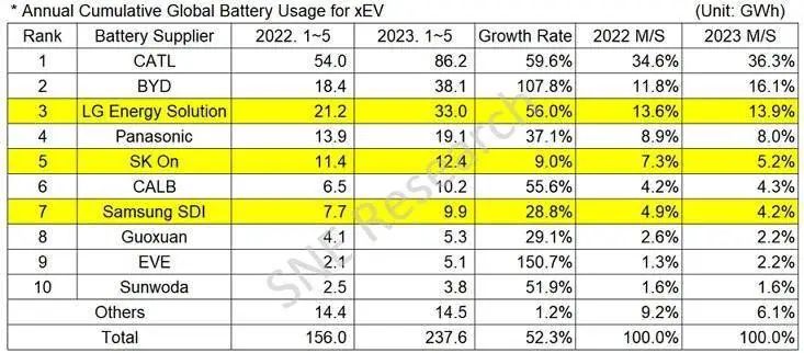 中國(guó)粉體網(wǎng)訊 7月5日,韓國(guó)研究機(jī)構(gòu)SNE Research發(fā)布的最新數(shù)據(jù)顯示,2023年1-5月,全球動(dòng)力電池裝車(chē)量237.6GWh,同比增長(zhǎng)52.3%。