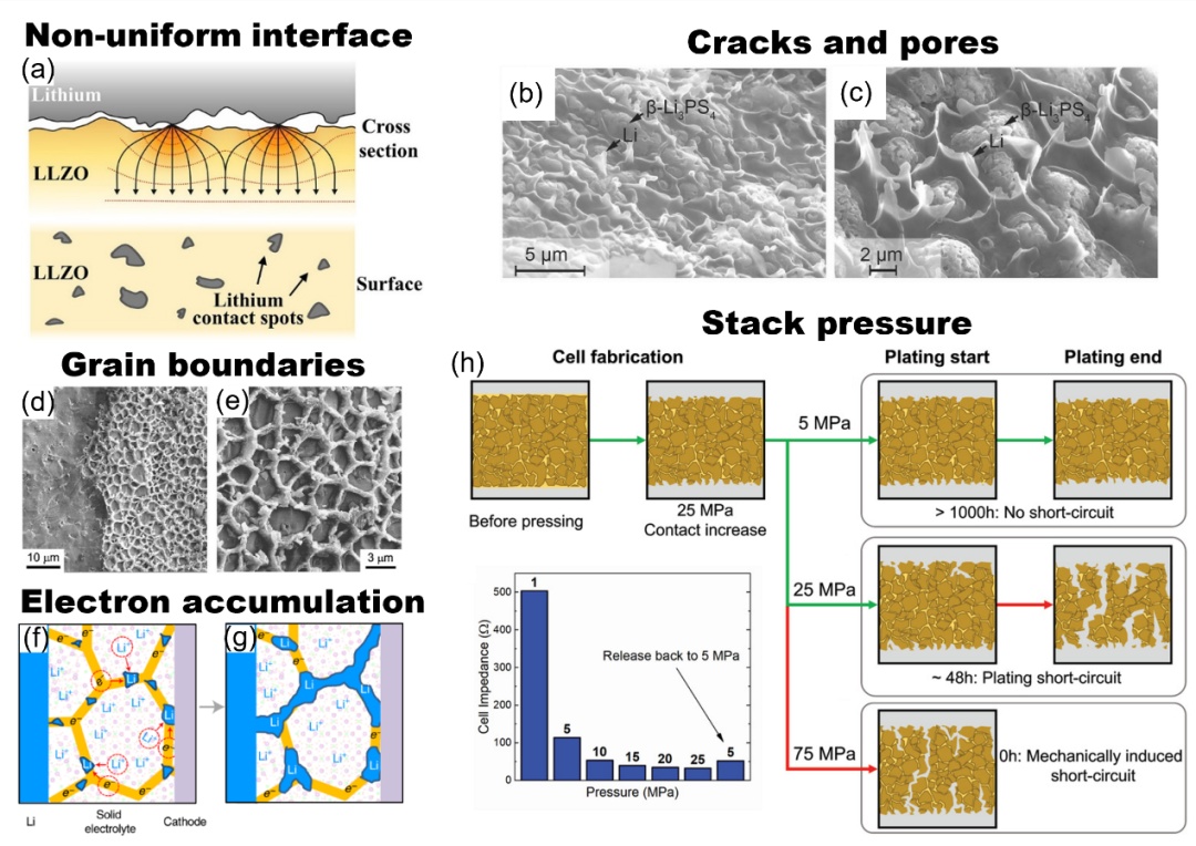 圖1.(a)SE和Li金屬之間的不均勻界面接觸導致熱點處的電場放大,從而引發Li枝晶生長;經許可復制,版權所有2019,AmericanChemicalSociety。(b-c)斷裂的LPSSE表面的SEM圖像,顯示在SE聚集體之間的裂紋和孔隙處的Li枝晶生長;經許可復制,版權所有2017,WILEY¬CHVerlagGmbH&Co.KGaA,Weinheim(d-e)SEM圖像顯示了沿石榴石SE晶界的Li枝晶生長;經許可復制,版權所有2016,ElsevierLtd。(f-g)示意圖表明,晶界處的小禁帶和電子積累導致鋰枝晶生長;經許可復制,版權所有2021,Xiao ming Liu etal.under exclusive licence to Springer Nature Limited。(h)示意圖顯示了堆疊壓力對SE中鋰枝晶擴展和電池阻抗的影響。經許可復制,版權所有2019,WILLEY¬CHVerlagGmbH&Co.KGaA,Weinheim