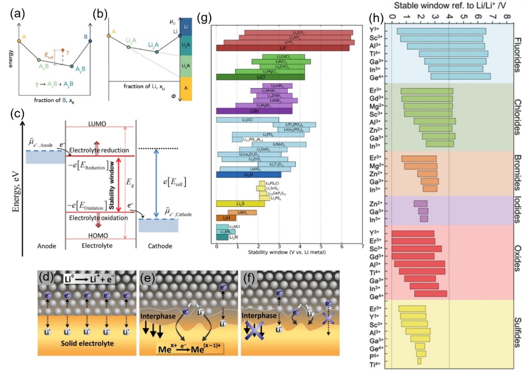 圖3.(a)顯示元素A和B之間相穩定性的巨電勢相圖;(b)揭示A在不同Li化學勢下穩定性的巨電勢相圖;(a-b)經許可復制。[99]版權所有2018,ElsevierInc.(c)陽極鋰化學勢高于電解質還原極限導致電解質的鋰化和還原,陰極鋰化學勢低于電解質氧化極限導致電解質的脫鋰和氧化;經許可復制,版權2018,RoyalSocietyofChemistry。(d)不發生SE分解的理想SE/Li界面有助于快速鋰離子傳輸;(e)SE分解形成的混合導電界面導致界面處持續SE分解;(f)具有低Li離子電導率的純Li離子導電界面相阻礙Li離子傳輸但抑制SE進一步分解;(d-f)經許可復制,版權所有2015,ElsevierB.V.(g)理論計算各種SE的電化學穩定性窗口;經許可復制,版權所有2015,AmericanChemicalSociety。(h)理論計算具有不同陽離子的各種SE的電化學穩定性窗口。經許可復制,版權所有2019,Wiley¬CHVerlagGmbH&Co.KGaA,Weinheim