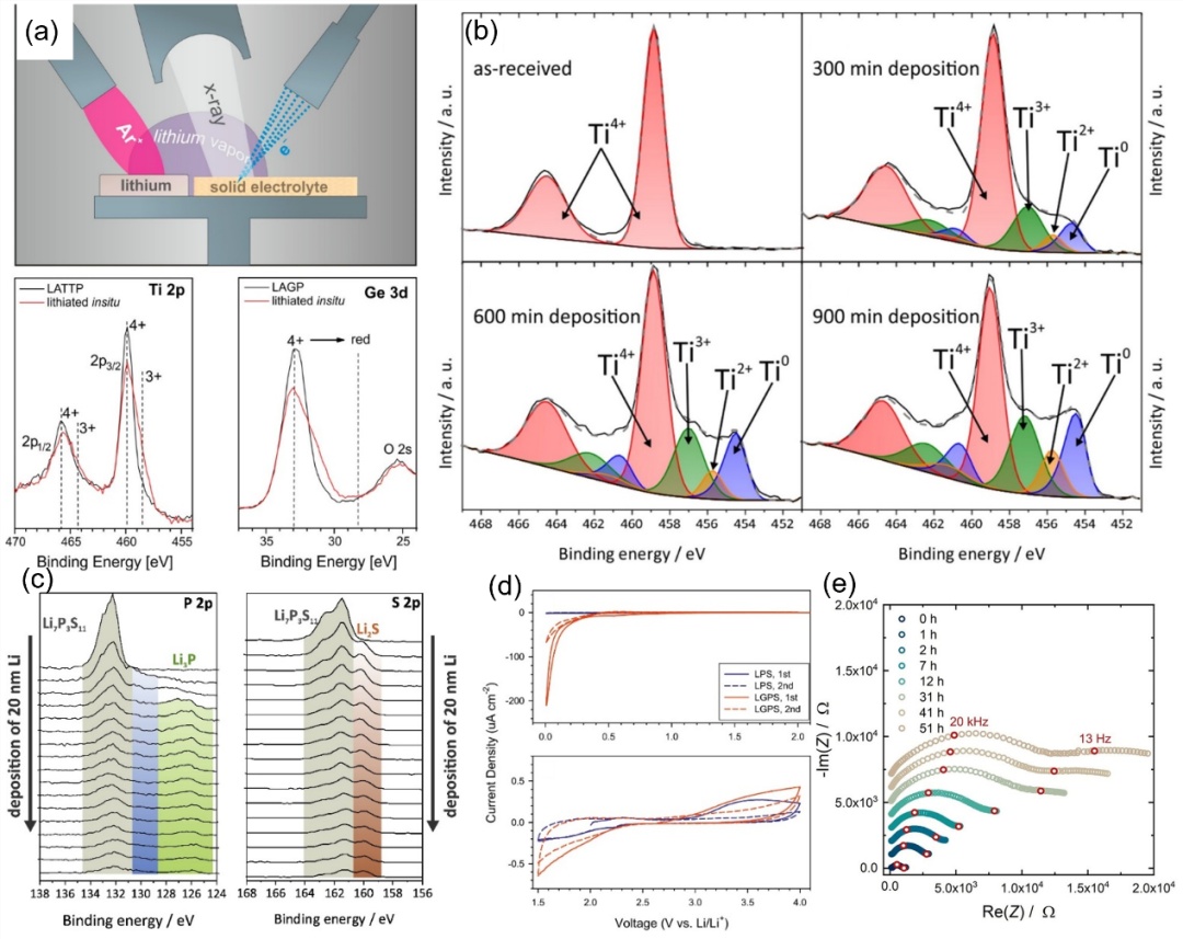 圖4.(a)NASICON型SE的原位XPS裝置和Ti2p和Ge3d的光譜示意圖;經許可復制,版權所有2013,AmericanChemicalSociety。(b)原位XPS光譜顯示,在不同Li沉積時間,LLTO中Ti的還原;經許可復制,版權所有2015,ElsevierB.V.(c)P2p和S2p原位XPS光譜顯示Li7P3S11的還原以及鋰化后Li3P和Li2S的形成;經許可復制,版權2015,ElsevierB.V.(d)循環伏安法表明,LGPS在第一和第二個循環中分解,而LPS由于鈍化層的形成而在第二個周期中達到穩定;經許可復制,版權所有2014,Elsevier。(e)時間分辨阻抗譜顯示,由于Li3InCl6在Li陽極側的連續還原,對稱Li/Li3InCl6/Li電池的界面電阻隨著時間的增加而增加,光譜疊加有1k的位移且沒有重新縮放。經許可復制,版權所有2020,LuiseM.Riegger,etal.AngewandteChemie,WileyVCHGmbH。