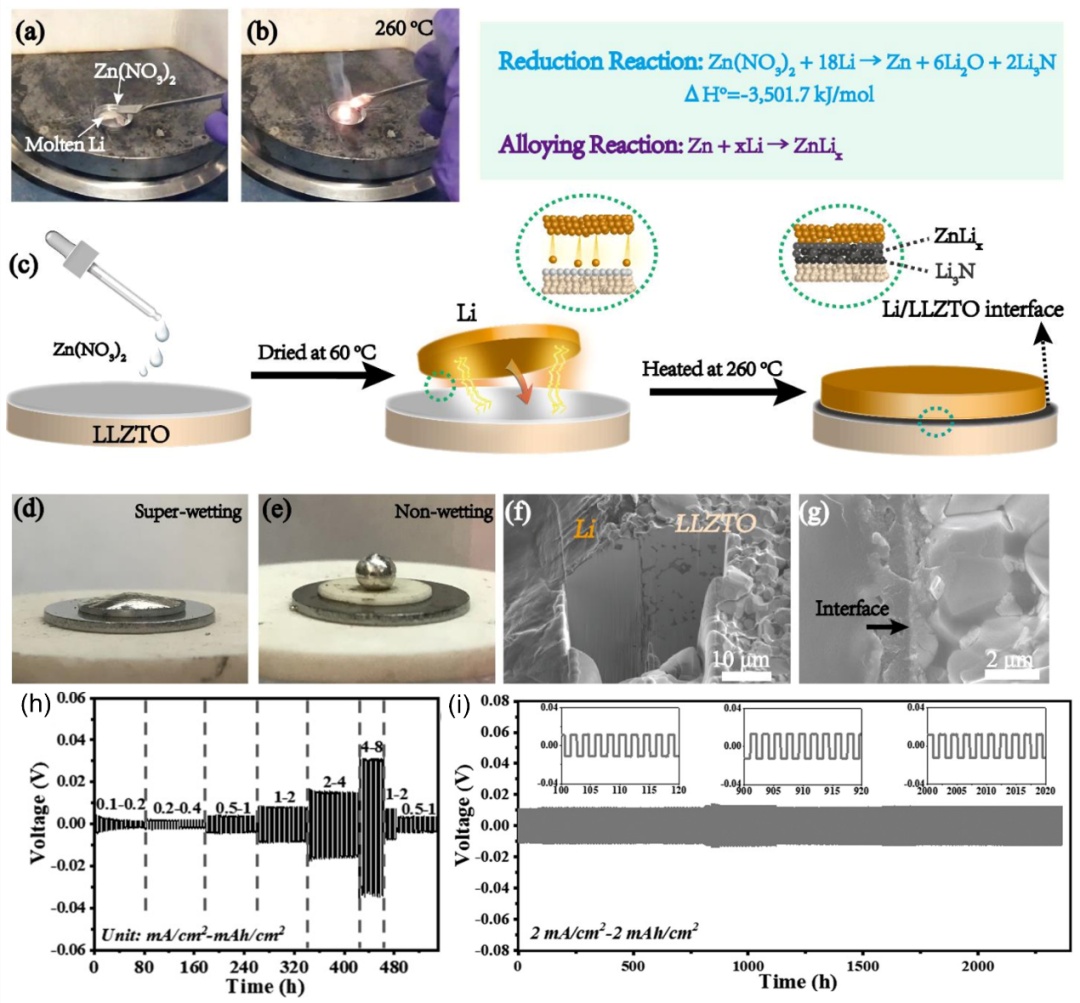 圖6.(a)熔融鋰上沉積Zn(NO3)2;(b)Zn(NO3)2與Li在260℃反應;(c)示意性示出了在Li和LLZO型SE之間制備ZnLix/Li3N基界面層的過程;(d)熔融鋰對含有ZnLix/Li3N涂層的LLZO的浸潤性;(e)熔融鋰對LLZO的潤濕性;(f)SEM顯示Li和ZnLix/Li3N涂覆的LLZO片之間的緊密接觸;(g)(f)中界面周圍的放大視圖;(h)鋰對稱電池在不同電流密度恒電流充/放電下的電化學性能;(i)鋰對稱電池在2mAcm-2恒電流充電/放電下的循環性能。經許可復制,版權2020,WileyVCHVerlagGmbH&Co.KGaA,Weinheim。