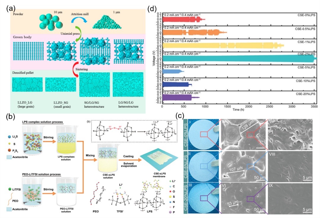 圖8.(a)顯示了制造具有不同晶粒尺寸的LLZO的程序示意圖;經許可復制,版權所有2015,AmericanChemicalSociety。(b)生產LPS–PEO–LiTFSI復合固體電解質(CSE)膜的實驗程序示意圖;(c)顯示LPS–PEO–LiTFSI復合固體電解質膜表面形態的光學和SEM圖像;(d)使用LPS–PEO–LiTFSI復合固體電解質膜(具有不同LPS含量)在0.2mAcm-2恒電流充電/放電下的Li對稱電池的循環性能。(b-d)經許可復制,版權所有2022,WileyVCHGmbH。