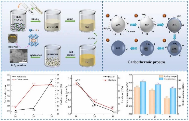 科研人員基于溶膠-凝膠協(xié)同碳/硼熱還原法,提出以山梨醇作為碳源,硼酸為硼源,使溶膠前驅(qū)體體系中碳、硼和金屬三種元素有效聯(lián)接,實(shí)現(xiàn)了分子級(jí)混合,在較低裂解溫度下實(shí)現(xiàn)陶瓷化,保障了粉體純度的同時(shí)降低了粉體粒徑,獲得了高純超細(xì)的ZrB2陶瓷粉體。