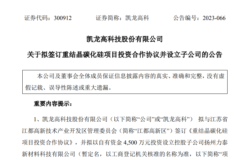 中國粉體網(wǎng)訊 7月13日,凱龍高科公告,公司擬與江蘇省江都高新技術產(chǎn)業(yè)開發(fā)區(qū)管理委員會(簡稱“江都高新區(qū)”)簽訂《重結晶碳化硅項目投資合作協(xié)議》,并擬以自有資金 4,500 萬元投資設立控股子公司揚州力泰新材料科技有限公司(暫定名,以下簡稱“項目公司”),由該控股子公司開展重結晶碳化硅DPF項目。
