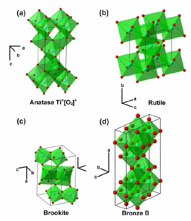 TiO2的主要晶型結構示意圖:(a)銳鈦礦、(b)金紅石、(c)板鈦礦、(d) TiO2-B