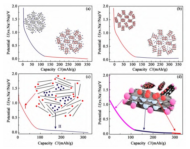 圖表1 硬碳材料儲鈉機理模型(a)插層-填孔機理模型;(b)吸附-插層機理模型;(c)吸附-填充機理模型;(d)吸附-插層-填孔機理模型