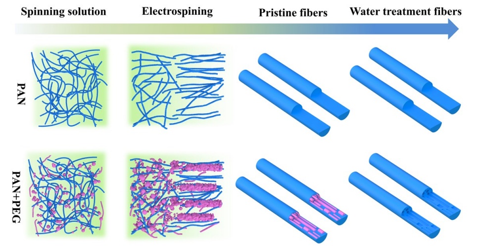 聚丙烯腈是由丙烯腈經自由基聚合制備的高分子材料,分子中有極性很強的氰基,分子鏈間的作用力強、化學穩定性好。經熱處理后,具備較高的電導性及良好離子傳導性。此外,聚丙烯腈具有含氮基團,碳化后實現氮原子摻雜,是鈉離子電池負極材料的一種重要選擇。Ren等人[13]以聚丙烯腈和聚乙二醇的紡絲液進行靜電紡絲制得了多通道且自支撐的硬碳負極材料,多通道形成機理圖如圖表5所示。優化的電極材料在0.1C下具有365.4mAh/g的可逆比容量且在0.4C下充放電300圈后容量保持率達90%。Chen等[14]通過對聚丙烯腈進行靜電紡絲并熱解,制備了碳納米纖維材料.由于其獨特的纖維結構,具有優異的循環性能和倍率性能.在1A/g和2A/g的電流密度下,在200個循環后,比容量保持率分別達到了99.7%和98.6%。