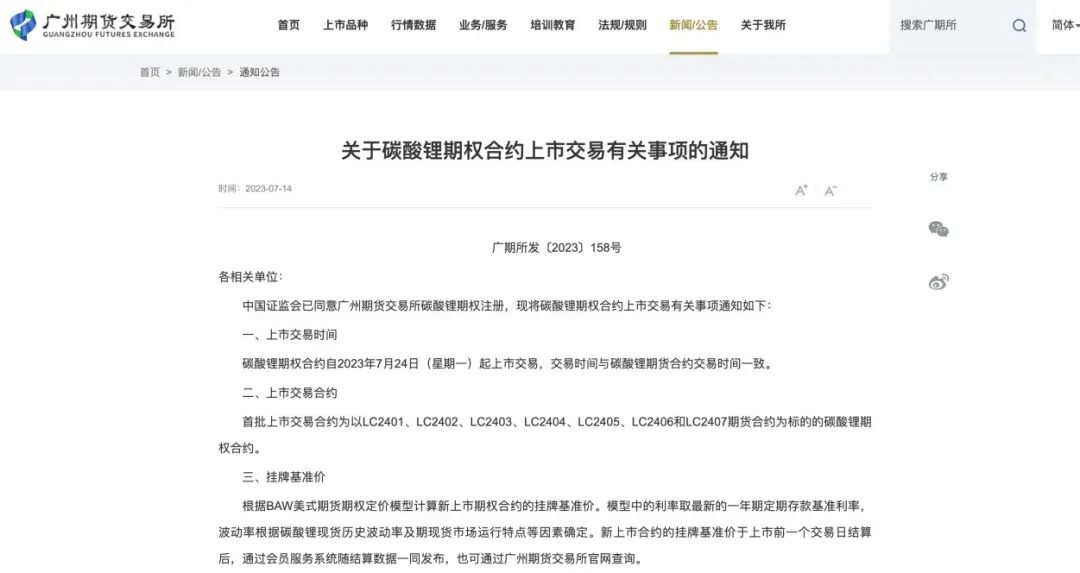 近日,證監(jiān)會同意廣期所碳酸鋰期貨及期權(quán)注冊。廣期所發(fā)布消息稱,碳酸期貨合約自2023年7月21日(星期五)起上市交易。碳酸鋰期貨及期權(quán)上市后,廣期所新能源金屬期貨品種板塊將初步形成。