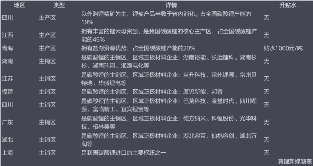 交割區(qū)域上,碳酸鋰期貨交割點分布在主產(chǎn)銷區(qū),包括四川、江西、青海3個省,其中江西為基準交割地,四川不設(shè)貼水。考慮到青海地區(qū)較為偏遠,相較于其他兩個產(chǎn)區(qū)的運輸成本明顯偏高,因此貼水1000元/噸。主銷區(qū)包括湖南、江蘇、福建、廣東、湖北和上海6省(市),也不設(shè)貼水。