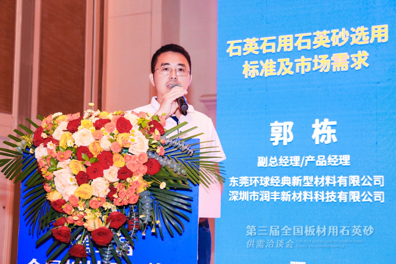 東莞環(huán)球經典新型材料有限公司&深圳市潤豐新材料科技有限公司的副總經理/產品經理郭棟作《石英石用石英砂選用標準及市場需求》報告