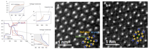 圖2. Na3MnTi(PO4)3的電壓遲滯現象及Mo摻雜前后的原子分辨率HADDF-STEM圖像