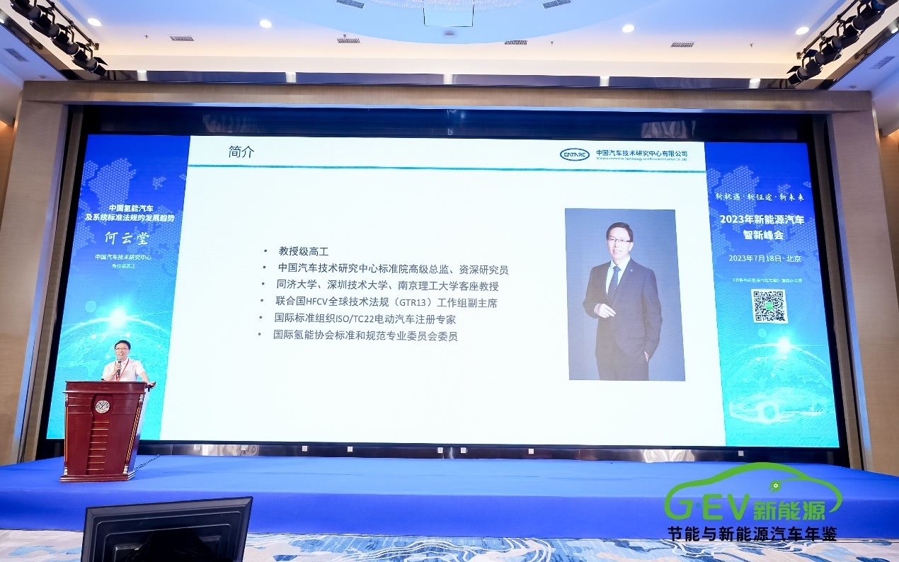 峰會現(xiàn)場,中國汽車技術研究中心有限公司標準院高級總監(jiān)、資深研究員何云堂發(fā)表了《中國氫能汽車及系統(tǒng)標準法規(guī)的發(fā)展趨勢》主旨報告。該報告分享了中國燃料電池汽車標準和聯(lián)合國燃料電池汽車全球技術法規(guī)等內(nèi)容,并對重點標準進行了解讀。