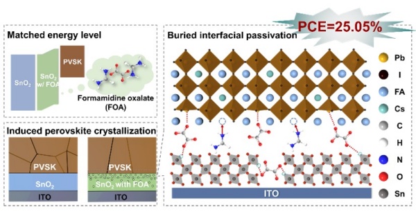 研究發現,甲脒離子和草酸根離子在SnO2層中均呈縱向梯度分布,聚集在SnO2/鈣鈦礦埋底界面處,調節鈣鈦礦的晶體生長,降低體相及界面缺陷,改善鈣鈦礦和SnO2之間的能級匹配。結果表明,FOA處理后的PSCs能量轉換效率從22.40%提高到25.05%,同時PSCs的存儲穩定性和光穩定性也顯著提升。