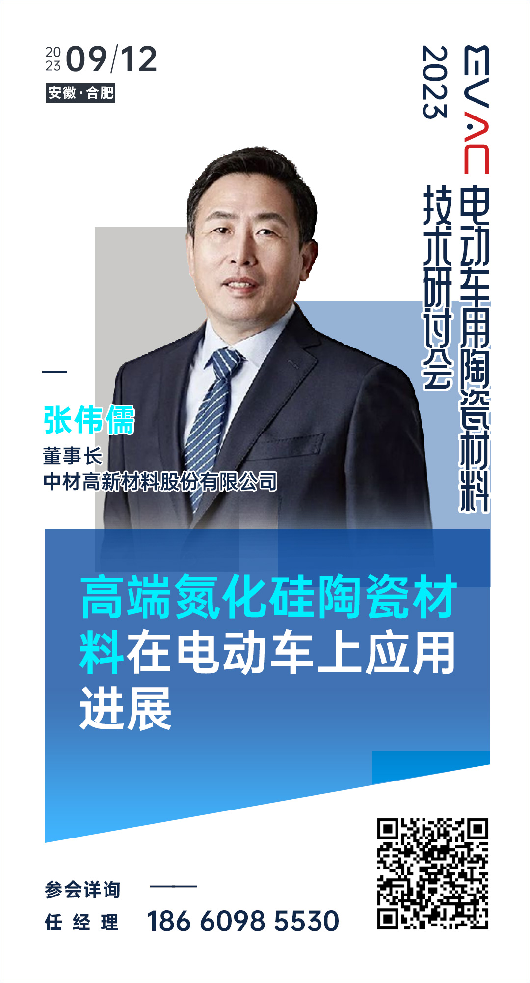 在電動化浪潮的席卷下,氮化硅陶瓷材料已成為電動汽車軸承和散熱基板的最優之選。在此背景下,中國粉體網將于2023年9月12日在合肥舉辦“第一屆電動車用陶瓷材料技術研討會”。屆時,來自中材高新材料股份有限公司董事長張偉儒將帶來題為《高端氮化硅陶瓷材料在電動車上應用進展》的報告,歡迎報名參會。