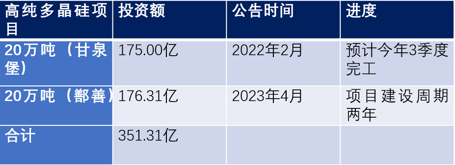 2022年2月,推出年產20萬噸高純多晶硅項目(甘泉堡),投資規模為175.00億元;2022年完成了40%建設,預計今年3季度完工。