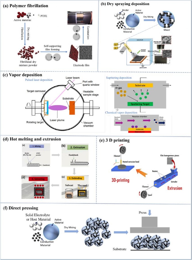 大多數(shù)SF工藝電極的制造程序包括三個(gè)步驟:干混、干涂層(干沉積)和最后的壓制,以達(dá)到所需的厚度和致密的電極結(jié)構(gòu)。也可以在干混后直接進(jìn)行壓制。根據(jù)干式涂層(沉積)過程的不同,SF工藝可以進(jìn)一步分為六種不同類型:聚合物纖維化、干噴沉積、氣相沉積、熱熔和擠壓、3D打印和直接壓制。圖1展示了每種工藝的示意圖。表1總結(jié)了這六種不同類型的優(yōu)缺點(diǎn)比較。