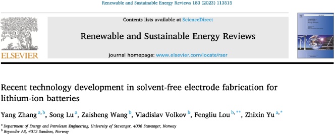 Yang Zhang, Song Lu, Zaisheng Wang, Vladislav Volkov, Fengliu Lou, Zhixin Yu, Recent technology development in solvent-free electrode fabrication for lithium-ion batteries, Renewable and Sustainable Energy Reviews, Volume 183, 2023, 113515, ISSN 1364-0321.