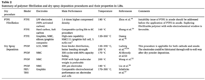 不同的SF技術(shù)適用于不同的應(yīng)用。纖維化和干粉沉積技術(shù)與商業(yè)鋰電生產(chǎn)線兼容。表2總結(jié)了纖維化和干噴沉積程序的主要特點(diǎn)。