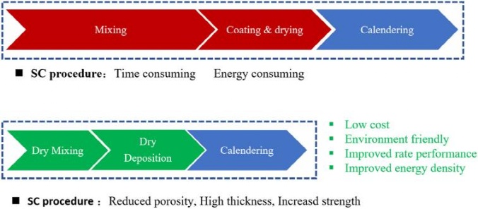 鋰離子電池(LIBs)的成本和性能在很大程度上取決于電極的制造工藝。目前商用鋰離子電池的電極制造通常采用slurry-casting (SC) procedure即濕法涂布工藝,這限制了電極的厚度。為了克服這個(gè)限制,solvent-free (SF) procedure即干法制造工藝是一種有希望的解決方案。SF工藝不使用溶劑,通過干法均化粘合劑與活性材料和導(dǎo)電劑,可以制造出厚電極而無(wú)需擔(dān)心粘合劑分布不均的問題。增加電極厚度可以顯著提高能量密度,并降低制造成本。許多電池公司已經(jīng)在SF工藝電極制造方面進(jìn)行了研究,并有一些成功的商業(yè)應(yīng)用案例。然而,SF工藝在商業(yè)化中仍面臨技術(shù)和工程上的挑戰(zhàn)。需要解決技術(shù)和工程上的難題才能在工業(yè)化生產(chǎn)中廣泛應(yīng)用。