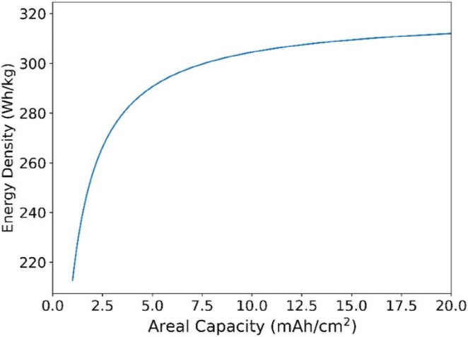 圖7. NMC811/石墨電池的比能量與石墨陽(yáng)極面積容量的函數(shù)關(guān)系。