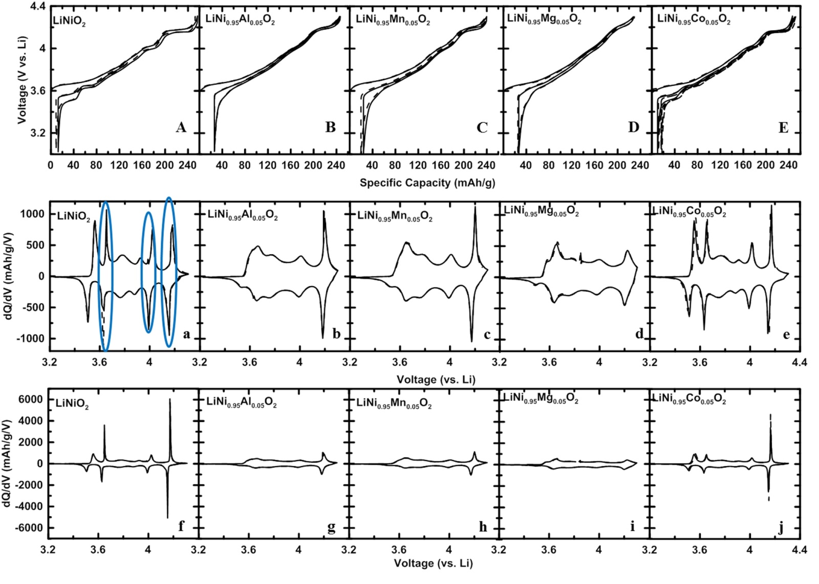 LiNiO2、LiNi0.95Al0.05O2、LiNi0.95Mn0.05O2、LiNi0.95Mg0.05O2和LiNi0.95Co0.05O2的電壓曲線和dQ-dV曲線(來源:LI H Y,et al.《Is cobalt needed in Ni-rich positive electrode materials for lithium ion batteries?》)
