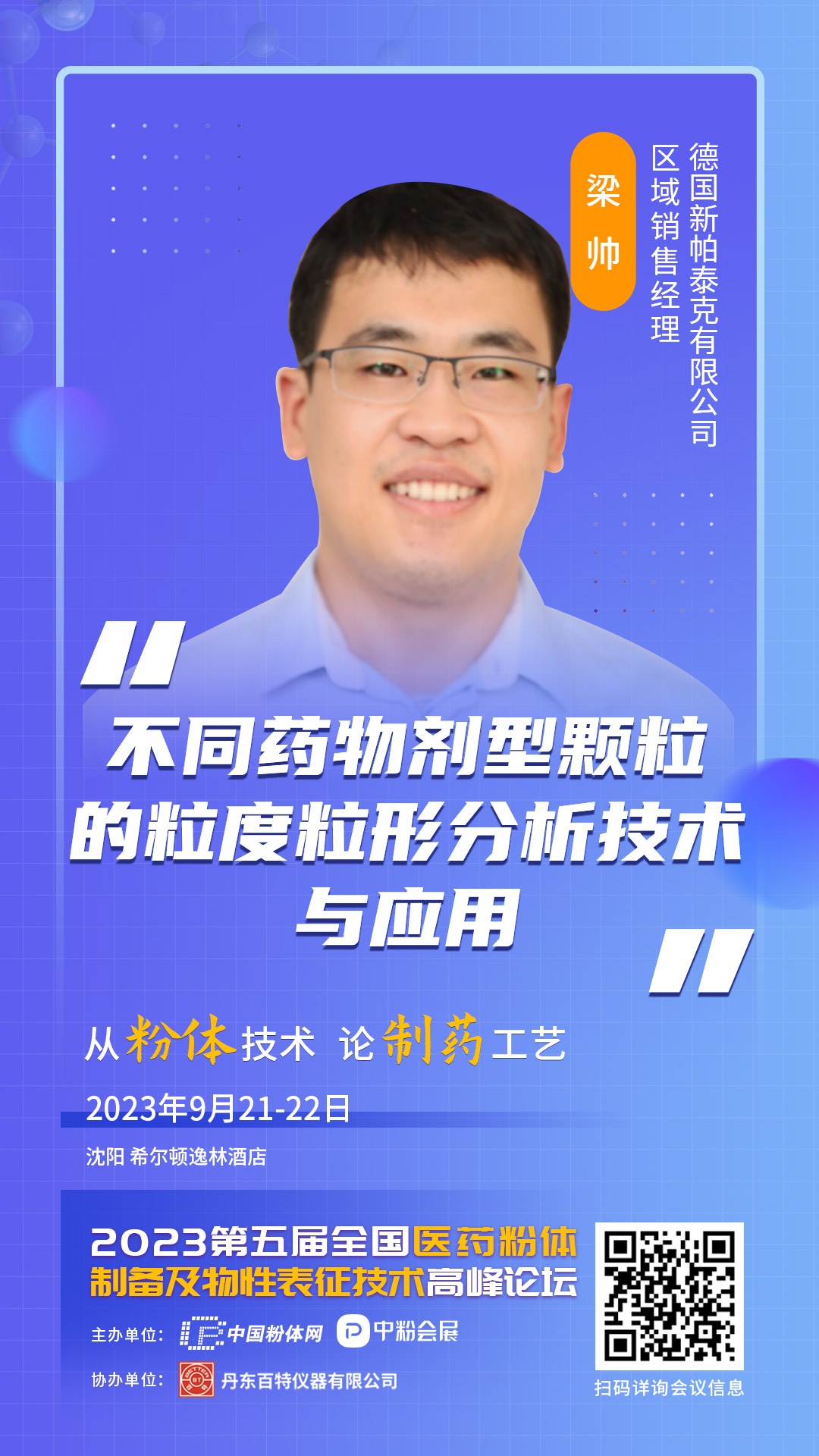 2023年9月21-22日,中國粉體網(wǎng)以“從粉體技術(shù),論制藥工藝”為主題,將在遼寧沈陽希爾頓逸林酒店舉辦“第五屆全國醫(yī)藥粉體制備及物性表征技術(shù)高峰論壇”,屆時(shí)將邀請(qǐng)來自德國新帕泰克有限公司的銷售經(jīng)理梁帥先生作《不同藥物劑型顆粒的粒度粒形分析技術(shù)與應(yīng)用》報(bào)告,現(xiàn)場(chǎng)報(bào)告中,報(bào)告主講人將列舉實(shí)際應(yīng)用案例,分享不同藥物的粒度粒形解決方案。