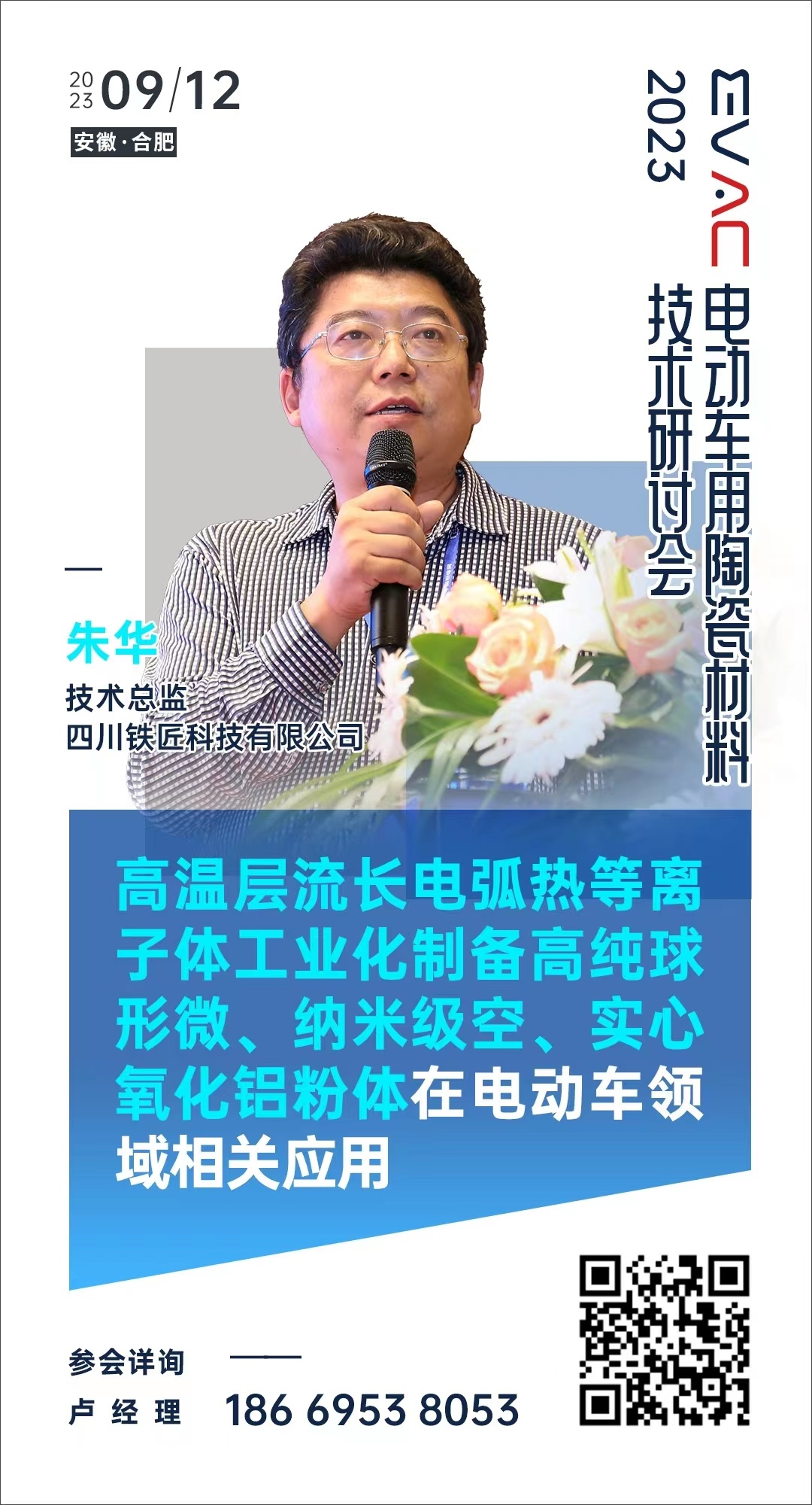 2023年9月12日,中國粉體網在合肥舉辦“舉辦“第一屆電動車用陶瓷材料技術研討會”。四川鐵匠科技有限公司朱華總監將帶來題為《高溫層流長電弧熱等離子體工業化制備高純球形微、納米級空、實心氧化鋁粉體在電動車領域相關應用》的報告。朱華先生將會詳細講述等離子體法制備球形氧化鋁粉體技術及實際應用。