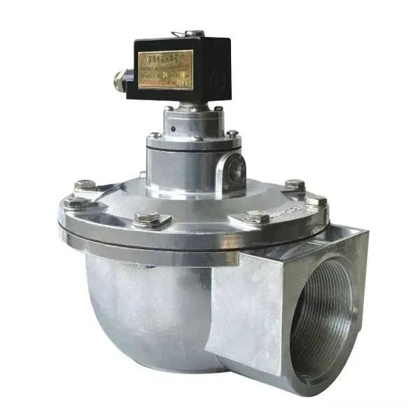 外螺紋式電磁脈沖閥由電磁先導頭、膜片和閥體組成,膜片后腔的面積大于前腔的面積,氣壓作用力大,使膜片處在關閉位置。電控儀輸入電信號,使電磁先導頭吸合動柱,打開卸荷孔,膜片后腔的壓力氣體迅速排出,膜片前腔的壓力氣體將膜片抬起,打開通道,脈沖閥進行噴吹。電脈沖信號消失,電磁先導頭的彈簧使動柱立即復位封閉卸荷孔,膜片后腔氣體壓力和彈簧作用力使膜片關閉通道,閥停止噴吹。膜片上的阻尼孔,當先導頭動柱抬起氣體壓力卸荷時,起到阻尼氣流的作用,當卸荷孔封閉時,使壓力氣體迅速充滿到后腔,使膜片關閉通道,停止噴吹。