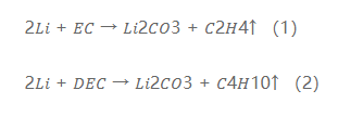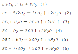 鋰離子電池電解液一般由LiPF6或其他電解質鋰鹽與DMC、DEC、EC有機溶劑混合組成。以下是當前主流商業電解質(LiPF6+EC+DEC)的分解反應方程:
