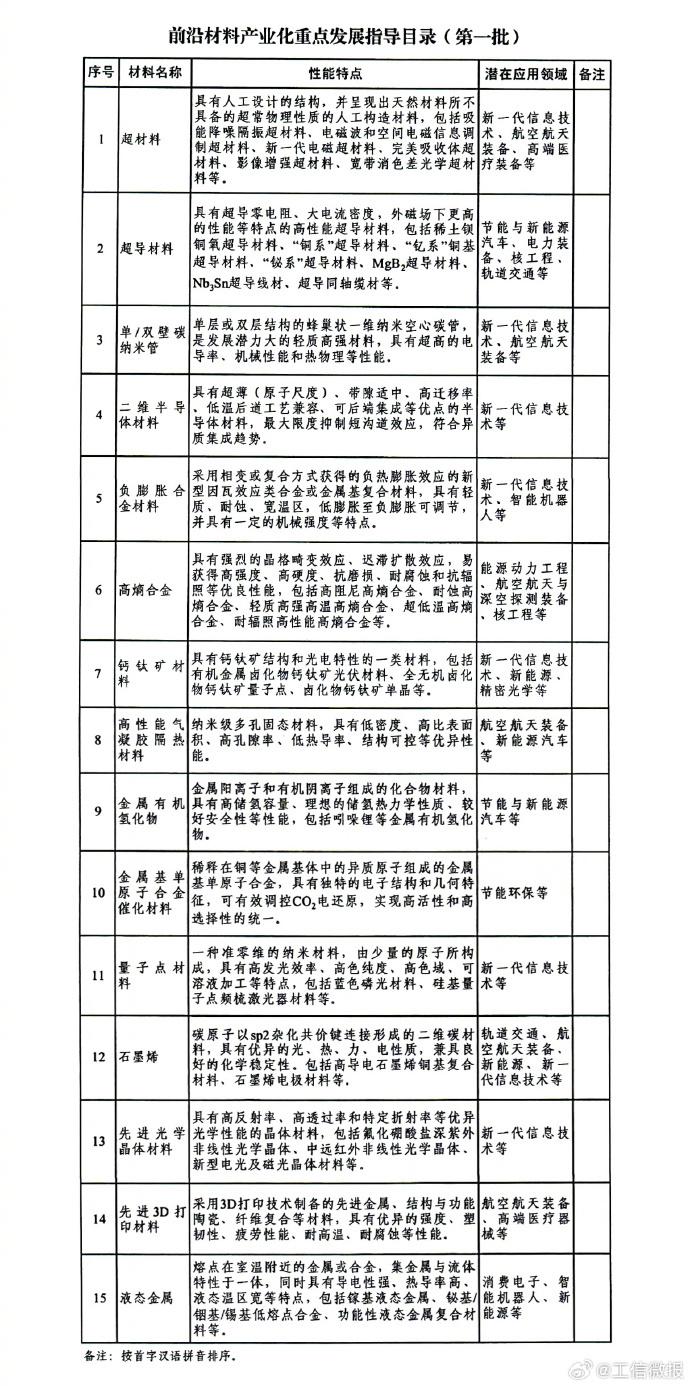 通知稱,新材料產業是戰略性、基礎性產業,是未來高新技術產業發展的基石和先導。前沿材料代表新材料產業發展的方向與趨勢,具有先導性、引領性和顛覆性,是構建新的增長引擎的重要切入點。為加快前沿材料產業化創新發展,引導形成發展合力,工業和信息化部、國務院國資委聚焦已有相應研究成果,具備工程化產業化基礎,有望率先批量產業化的前沿材料,組織編制《前沿材料產業化重點發展指導目錄(第一批)》,后續將根據技術發展情況,適時分批發布。
