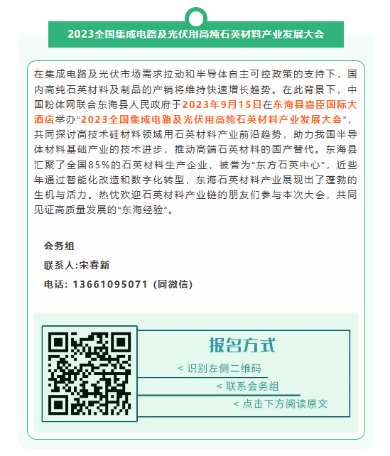 由中國粉體網主辦的“2023全國集成電路及光伏用高純石英材料產業發展大會”將于9月15號在東海舉辦,隆基綠能科技股份有限公司邀您一同參加。