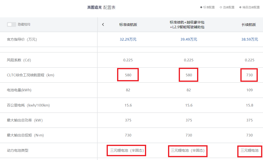 但是翻開嵐圖追光官網的配置表,小編發現這所謂的半固態電池好像看起來怪怪的。嵐圖追光一共有三個配置,前兩款車型CLTC續航里程為580km,使用的半固態電池,電量為82.11kWh,能量密度為170Wh/kg;另一款車型CLTC續航為730km,搭載的是嵐圖自研的云母電池(即常規三元鋰液態電解質電池),電量為108.73kWh,能量密度為212Wh/kg。